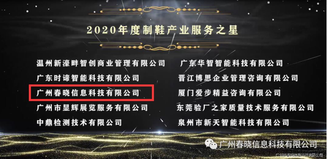 极具价值的干货分享之后,本届盛典最具参考价值的年度评选结果重磅揭晓。此次评选共有380家企业参与了鞋业盛典评选,经过各方数据的综合评估和专家顾问团队的慎重臻选。最广州j9娱乐信息科技有限公司荣获2020年中国鞋业盛典·造浪金奖2020年度制鞋产业服务之星的奖项,赢得了行业的高度认可。
